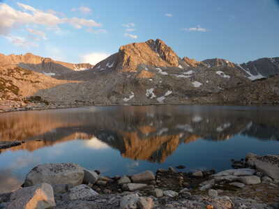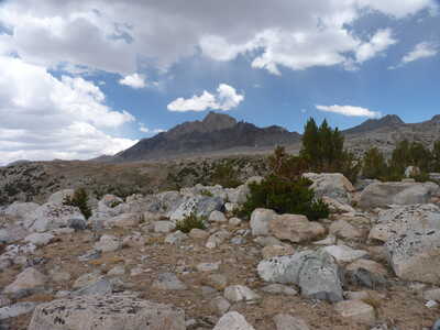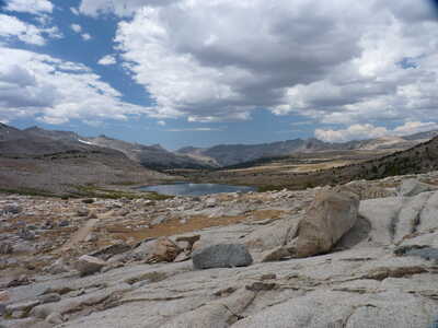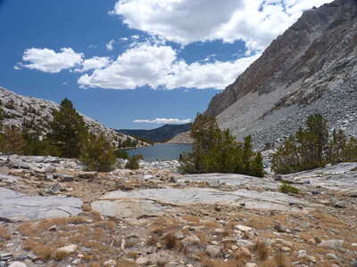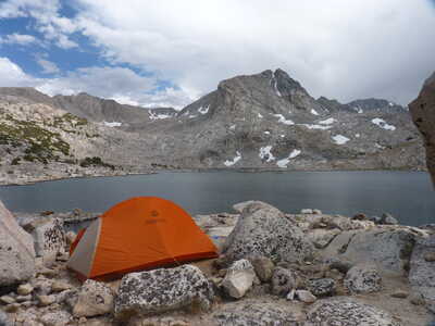 Journal Entry: First day of Humphreys Basin trek. Stayed at North Lake campground last night, started hiking from campsite at 9am. Clear skies to start, a few clouds around 11am, building a bit with a few sprinkles near the end. Steady uphill to Loch Leven and Piute Lake, then up to Piute Pass, arriving around 2pm. Easy hike on good trail over to Muriel Lake where we are camped. A few others are here. Clouds look to be clearing a bit now at 4:15. Tomorrow we explore some lakes off trail, and end at Tomahawk Lake.