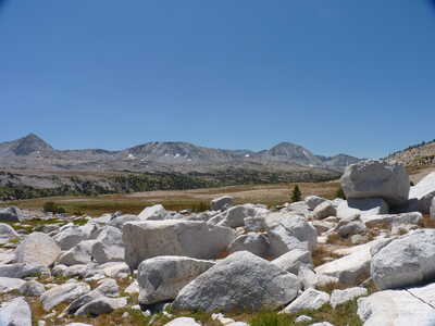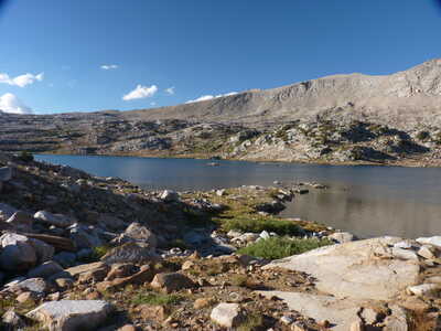 Journal Entry: A bit of dew last night, had to dry tents but still started walking about 8:30. Section of large talus to get to Royce Pass, but easy terrain all the way down to the trail up from Honeymoon Lake. Found our 1999 campsite, then headed up the trail to Pine Creek Pass. After a lunch break, headed off-trail to French Lake. Arrived around 2pm, but spent quite a while looking for a campsite. Trees are sparse in some areas. Found a campsite with some nice trees for shade before 3pm. Weather today is beautiful, with small clouds starting at 9:30 but not building much. Mostly blue sky at 4pm! Went for a swim in the lake. Refreshing! Tomorrow is a long day over Steelhead Pass and over to Humphreys Lakes.