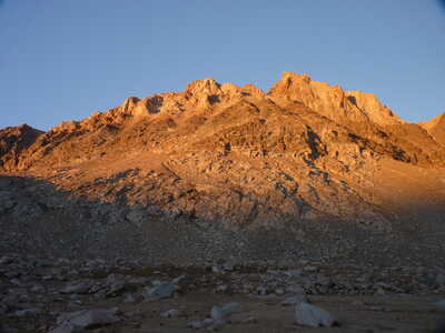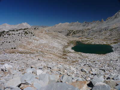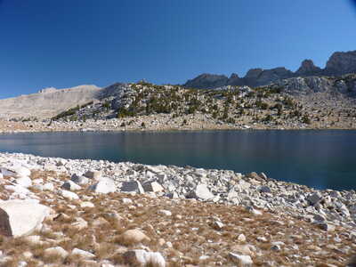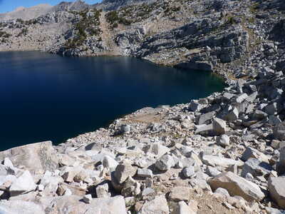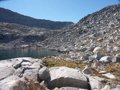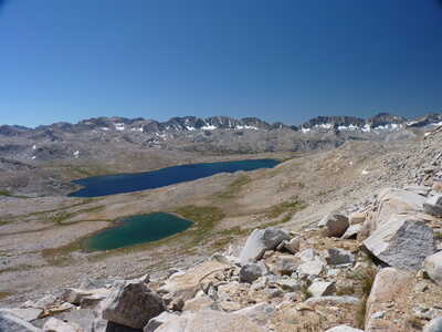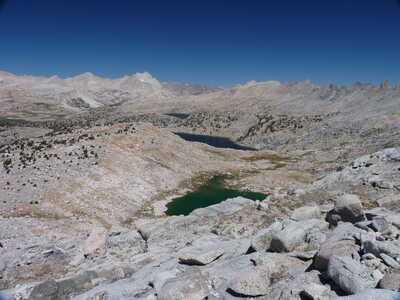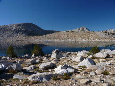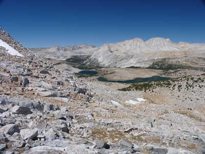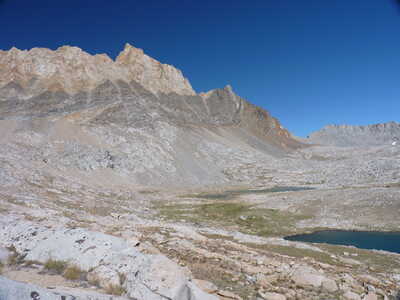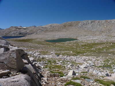 Journal Entry: Cold night—36F. Started walking around 8am. Dropped down and then up to get to Steelhead Lake over mostly easy terrain. Went around the lake on the west side and up some talus to Rust Lake. From there, 500 feet up a mix of large and small talus to some slabs near the pass. Our route had some class 3 moves. Downhill side easier and shorter, then over to the chute to Desolation Lake. We cut the corner to Forsaken Lake, then up a fairly easy grass/rock slope to above Humphreys Lakes. Camping right under Mt. Humphreys at one of the smaller lakes, large flat area with small gravel. Got here around 4:30. Almost no clouds today, so we are exposed to sun here at camp as there are no trees and few large rocks. Tomorrow we head down to Piute Pass and then Piute Lake.
